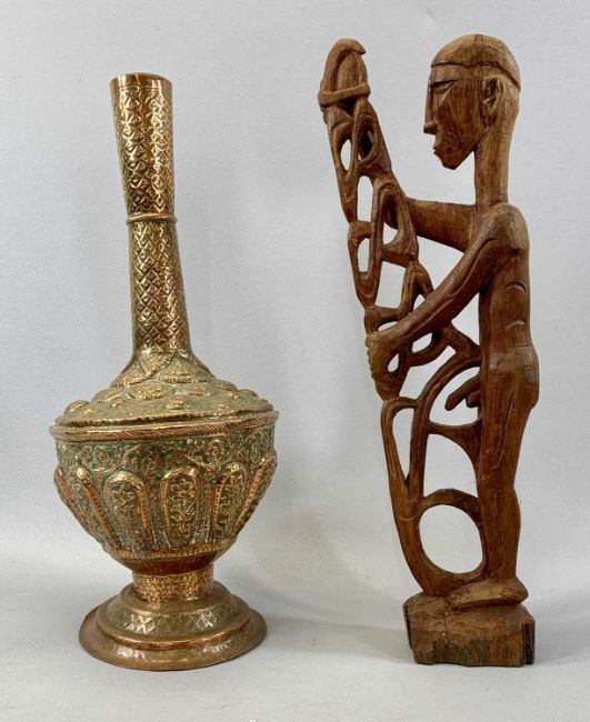 ITEMS OF ETHNOGRAPHIC INTEREST, including an African Senufo Chieftain's pipe, the wooden shaft set with bronze dear heads and wrapped in snakeskin, cast bronze bowl, 56 cms (l), 3 cast bronze figures, 15cms (h the tallest), ornately embossed copper vase with slender neck, 42cms (h), two carved hardwood busts, 21cms (h the tallest) etc.Provenance: deceased estate Gwynedd