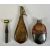 GROUP OF MIXED 19TH CENTURY & LATER COLLECTABLES, including leather shot flask, embossed with London coat of arms and with brass nozzle, 22.5cms L, a shot measure with adjustable brass nozzle and turned wooden handle, 13.5cms L, painted cast aluminium novelty money box, 2 x pairs of steel handcuffs with keys, and other items