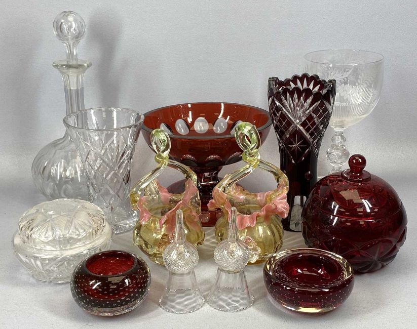 MIXED GLASSWARE including Georgian celery vase of goblet form, bowl etched with ferns, knopped column and on circular foot with star-cut base, 22cms (h), a Bohemian overlaid red and vase, 21cms (h), an overlaid red and clear bowl on circular foot with thumb-cut decoration, 20cms (diam.), circular decanter and stopper with thumb-cut decoration, 30cms (h)Provenance: deceased estate Gwynedd