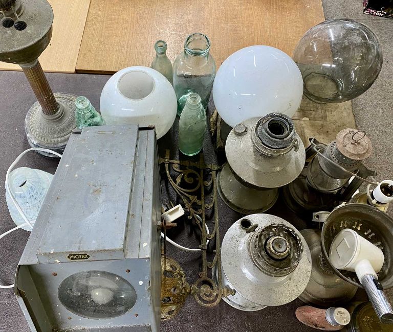 VINTAGE LIGHTING & OTHER ITEMS, including Photax spot lamp in grey steel cabinet, on adjustable stand, 40cms L, brass oil lamp with black ceramic base, fluted column, circular reservoir and twin burners, 50cms H, 2 x chrome oil lamps, 31cms H, Gremlin storm lamp cast iron oil lamp wall bracket, various glass shades, glass bottles, braille book 'The Gospel' ETC
