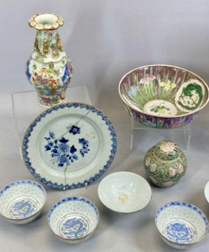 MIXED CHINESE CERAMICS, a Canton Famille Rose vase, 19th Century, of ovoid form with lobed rims and with gilded zoomorphic handles, the body decorated with figures and flowers, 22.5cms H, a Famille Rose bowl, decorated with enamelled flowers and panels with dragons, 4-character mark to base, 23.5cms diam., various rice bowls, blue and white plate and other items