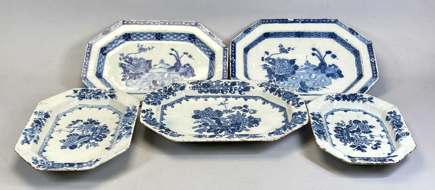 PAIR OF IRISH DELFT OCTAGONAL BLUE & WHITE SERVING PLATTERS, mid 18th Century, 'Vase of Feathers' pattern, 30 x 42cms, and 3 x similar Delft graduated blue and white octagonal serving platters, floral basket design, 30 x 43cms