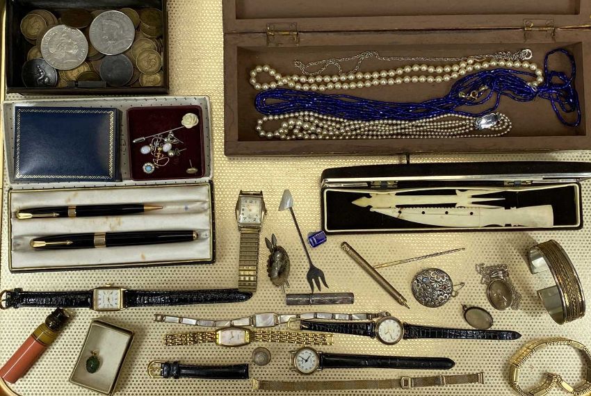 (LOT WITHDRAWN FROM AUCTION) - MIXED JEWELLERY, WATCHES, COINS & OTHER COLLECTABLES, including Victorian yellow metal propelling pencil, machine engraved decoration and inscribed 'Kittine', silver needle case, white metal and mother-of-pearl bracelet, 2 x simulated pearl necklaces, vintage Parker 17 pen and pencil set, black with gold coloured bands and clips, boxed, 2001 commemorative £5 coin ETC