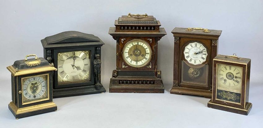COLLECTION OF FIVE MANTEL CLOCKS, comprising a reproduction bracket clock, dial with silver chapter ring and visible pendulum, 25cms H, German 8-day clock, chiming movement, 24cms H, 2 x London Clock Company, with quartz movements and one other