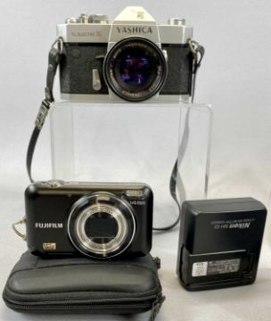 CAMERAS & ACCESSORIES including Olympus OM-1 SLR with 50mm lens, Yashica TL Electro SLR camera with 50mm lens, various accessories, Nikon Coolpix 4500 digital camera ETC