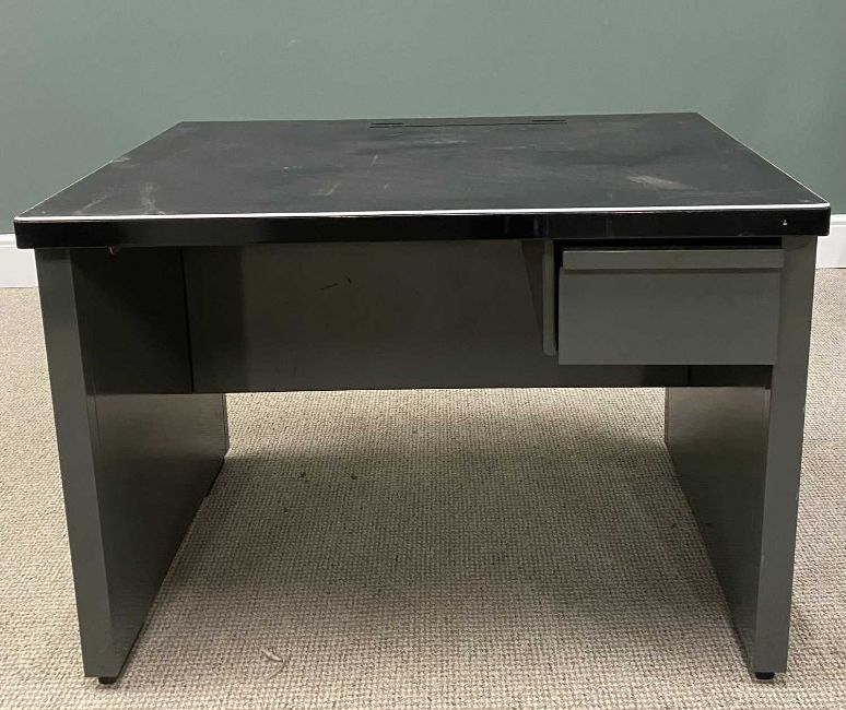 EX-POST OFFICE INDUSTRIAL TYPE METAL DESK, black and grey livery, single drawer, slider, closed slab ends, 68.5 (h) x 96.5 (w) x 72.5cms (d)Provenance: private collection Conwy
