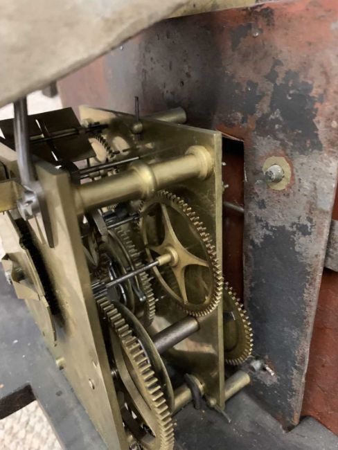 ANTIQUE MOON-PHASE DIAL LONGCASE CLOCK, indistinctly signed dial, arched painted moon phase wheel, Roman numerals, subsidiary seconds dial, twin weight pendulum driven bell strike movement (pendulum and weights included), broken swan neck hood pediment, single glazed door, capped spindle pillars, shaped top trunk door, quarter cut reeded side pillars, stepped trunk base, 218 (h) x 49cms (w)Provenance: private collection Gwynedd