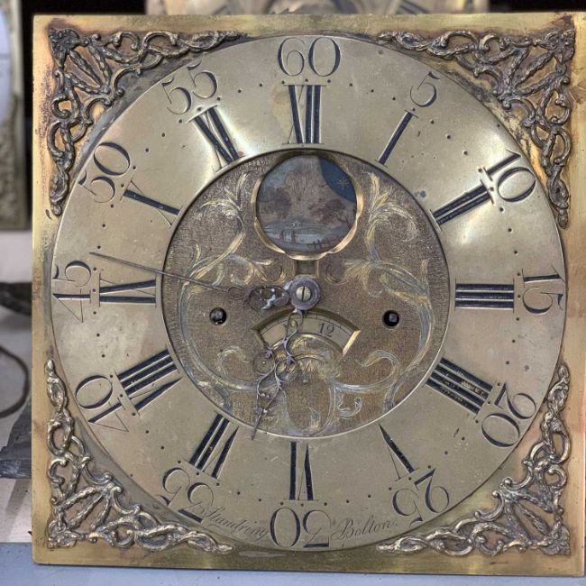 LARGE GROUP OF ANTIQUE CLOCKS / CLOCK PARTS workshop contents including 13 trunks, some with hoods, 14 hoods, 14 dials/movements to include Davoust, Phillip Dickinson rolling-moon, Jones of Denbigh, Jones of Ruthin, John Roberts, Richards of Dolgelly, Standring of Bolton, Hariman of Workington, Andrew Knowles, Watkin Owen of Llanrwst and others, includes approx. 60+ weights, with a quantity of pendulums and other related partsProvenance: private collection Conwy