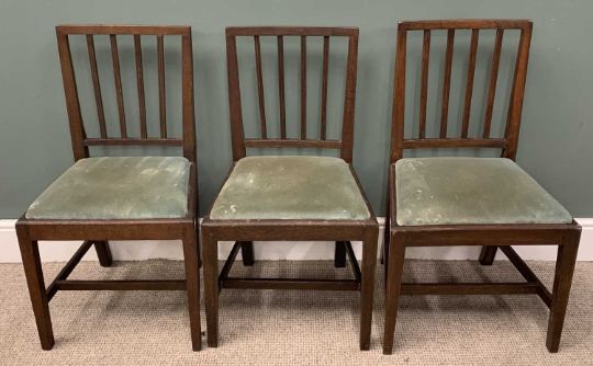 HARLEQUIN SET OF TEN ANTIQUE DINING CHAIRS (6+4), similarly styled and construction, various woods, upholstered drop in seat pads, square tapering supports, H stretchers, 87 (h) x 50.5 (w) x 38cms (seat d), some restorations requiredProvenance: private collection Conwy