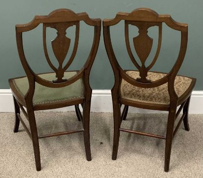 CIRCULAR TOP LOO TABLE & TWO INLAID SIDE CHAIRS both mid-Victorian, table in flame mahogany and cross banded rosewood, beaded frieze, turned pedestal, four splayed supports, brass hairy paw cups and castors (no retaining bolts for the top), 67.5 (h) x 118.5cms (top diam.), inlaid urn shield shaped backs, upholstered seats, splayed supports, spindled stretchers, 85 (h) x 43 (w) x 42cms (seat d)Provenance: private collection Wirral