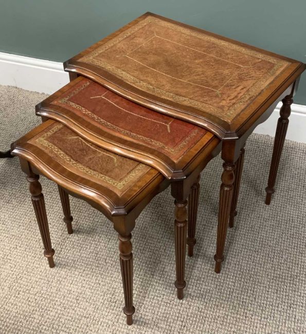 GROUP OF CLASSIC ANTIQUE STYLE FURNITURE including reproduction whatnot, 90 (h) x 67 (w) x 37cms (d), a Lyre end sofa table, 55 (h) x 48 (w) x 38cms (d), three wine tables, 62 (h) x 38cms (diam.) the largest, and a nest of three tooled top tables, 55.5 (h) x 56 (w) x 41.5cms (d) Provenance: private collection Flintshire