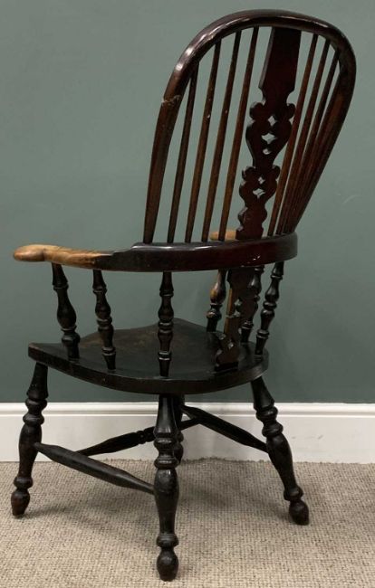 19TH CENTURY STAINED ASH & ELM WINDSOR ARMCHAIR, turned spindle hoop back, pierced central splat, curved back shaped arms, turned uprights, shaped solid seat, turned supports, H stretcher, 113 (h) x 68 (w) x 45cms (seat d)Provenance: private collection Flintshire
