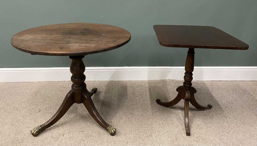 TWO ANTIQUE MAHOGANY TILT-TOP TRIPOD TABLES one with circular top, bulbous turned column, splayed reeded supports, hairy paw brass cups and castors, 72 (h) x 82cms (top diam.), rectangular top, turned column, splayed supports, 73 (h) x 62 (w) x 55cms (d)Provenance: private collection Conwy