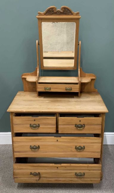 SATIN PINE BEDROOM FURNITURE, comprising single mirrored door wardrobe, blind fretwork panel detail, single lower drawer, 195.5 (h) x 95 (w) x 46cms (d), mirrored dressing chest, upper central drawer, side shelves, two short, two long lower drawers, plinth base, 167 (overall h) x 92 (w) x 53 (d)Provenance: private collection Flintshire