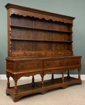 MODERN STAINED POTBOARD DRESSER, three shelf carved and boarded rack over six spice drawers, over three drawers, 192 (h) x 201 (w) x 49cms (d)Provenance: private collection Flintshire