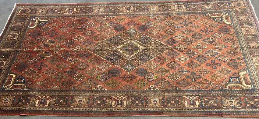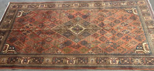 MEIMEH RUG, rust ground with multicoloured repeating border, diamond and geometrical patterns throughout with central motif, 3.05 x 1.65ms