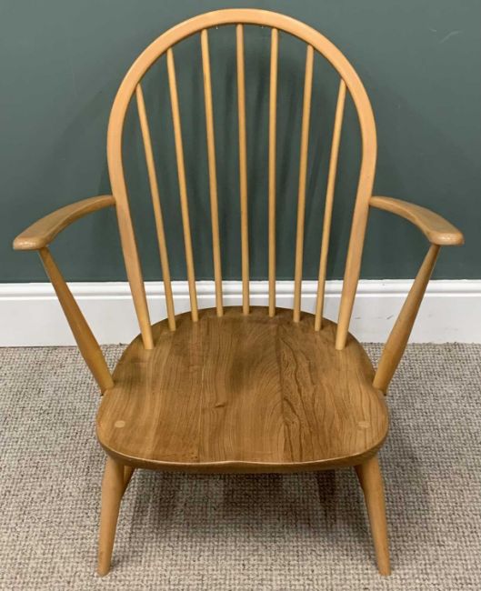 ERCOL BEECH HOOP & SPINDLE BACK EASY CHAIR, with cushions, 83 (h) x 70 (w) x 48cms (d)