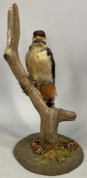 TAXIDERMY GREATER SPOTTED WOODPECKER, 20th century, modelled perched on a branch on naturalistic base, 30cms (h) overallProvenance: private collection Denbighshire