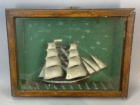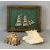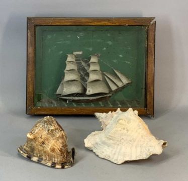 BRASS FIRE IRONS, CANDLESTICKS & BELLOWS, with two large seashells and a ship diorama, 29 (h) x 36.5 (w) x 7cms (d)Provenance: deceased estate Pwllheli