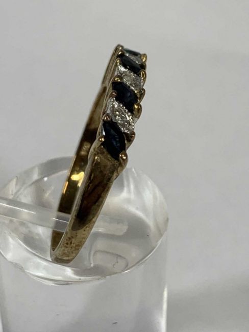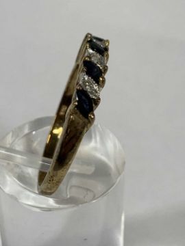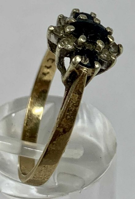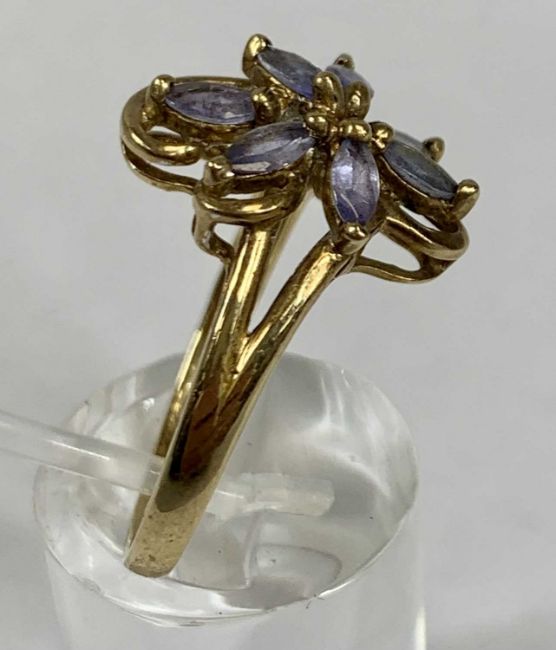 FOUR 9CT GOLD STONE SET RINGS comprising emerald and diamond chip band, size Q-R, floral blue stone set, size T, amethyst and diamond chip cluster, size P-Q and sapphire and diamond chip band, size Q-R, 11.5gms gross Provenance: deceased estate Carmarthenshire
