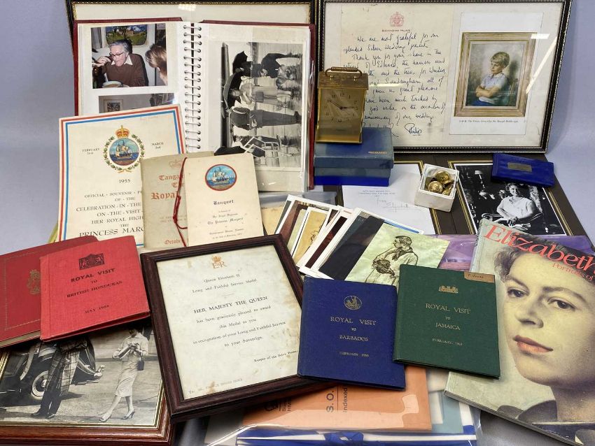 LARGE INTERESTING COLLECTION OF ROYAL EPHEMERA & MEMORABILIA, from the collection of a former employee of the Royal Household, two portrait Christmas cards from The Queen Mother, signed Elizabeth R, signed letter of thanks, Elizabeth & Phillip, signed letter of thanks, Anne & Mark, many personal photographs, Royal Visit programmes and menus, presentation carriage clock from Clarence House, letters from Buckingham Palace, uniform buttons and many other related itemsProvenance: private collection Gwynedd