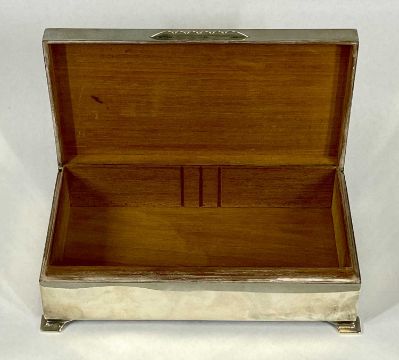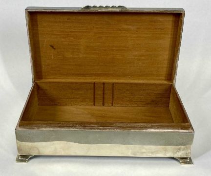 SILVER CIGARETTE BOX, four footed, machined lid, Birmingham, 5 (h) x 16.5 (w) x 9cms (d), 13.9ozt grossProvenance: private collection Conwy