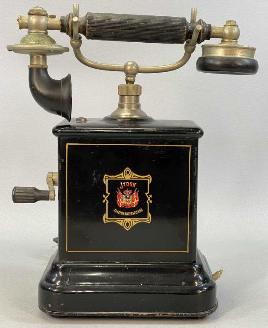 EARLY 20TH CENTURY JYDSK TELEFON AKTIESELSKAB - DANISH PILLAR TABLETOP TELEPHONE, with crank handle, Bakelite and chrome mounted receiver, the enamelled base inscribed in gilding, 32cms (h)Provenance: private collection Conwy