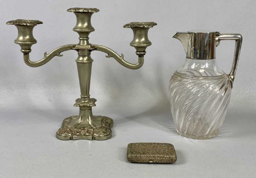 SILVER PLATED/WHITE METAL ITEMS, including a Gadebusch glass claret jug with EPNS mounts, 21cms (h), a large EPNS ladle, two silver plated trophies, rectangular cigarette case with chased decoration etc.Provenance: private collection Conwy