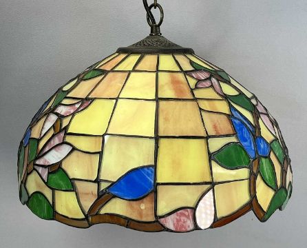 TIFFANY STYLE LEADED CIRCULAR LIGHT SHADE, brightly coloured floral panels on a pendant ceiling light fitting, 40cms (diam.)Provenance: private collection Conwy