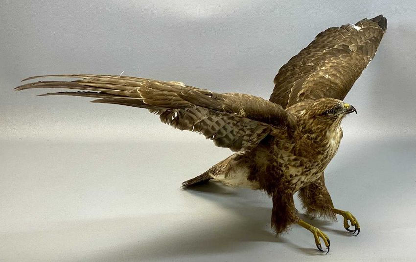 WITHDRAWN FOR FUTURE SALE PENDING CITES CERTIFICATE, APPLY WITHIN - TAXIDERMY BUZZARD, 20th century, modelled with outstretched wings, 100cms (w)Provenance: private collection Denbighshire