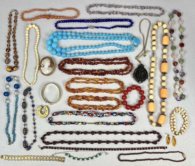 INTERESTING GROUP OF COSTUME JEWELLERY, including Murano and other glass bead necklaces, gold tone bangle bracelet and horseshoe brooch, amber earrings, cameo brooch, jet brooch and other itemsProvenance: private collection Ynys Mon