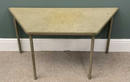 VINTAGE CLASSROOM FUNRISHINGS including six stacking wood and metal chairs, 73 (h) x 37 (w) x 36cms (d) and a similar type table, 55 (h) x 110 (w) x 49cms (d)Provenance: private collection Conwy