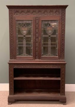 EDWARDIAN CARVED OAK BOOKCASE circa 1900, having an open two shelf base, below elaborately leaded glass upper doors, all around profuse floral carving, 181 (h) x 108 (w) x 34cms (d)Provenance: private collection Gwynedd