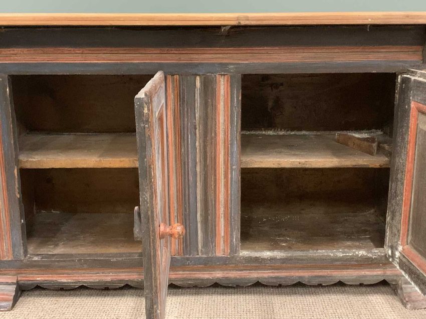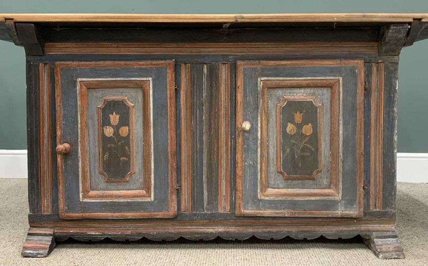 ANTIQUE PINE TABLE with painted two door cupboard base, 78(h) x 178 (w) x 65cms (d) Provenance: private collection Conwy