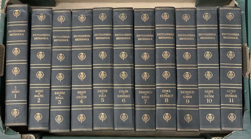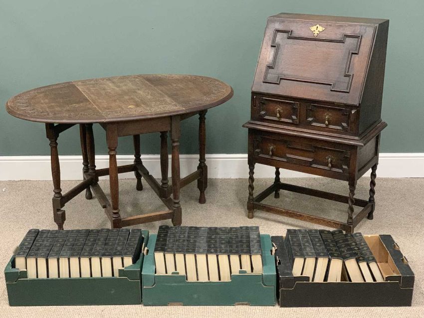 FURNISHING ASSORTMENT including Jacobean type bureau with two base drawers, 113 (h) x 69 (w) x 45cms (d), a carved top oak gateleg table on turned supports, 75 (h) x 43 (w - open), 123 (w - closed) x 92cms (d) and approx. 30 Britannica Volumes including Encyclopedias