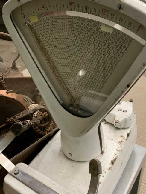 ASSORTED INDUSTRIAL FURNISHINGS ETC to include copper and cast kettles, fall front coal box, vintage Avery grocery scales, weights, fender, etc. Provenance: private collection Conwy