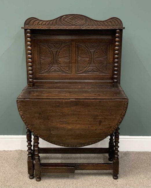 ANTIQUE DROP-LEAF TABLE UNSUALLY MARRIED WITH RAIL-BACK both elements carved, 136 (h) x 85 (w) x 90cms (d) (open)Provenance: private collection Conwy