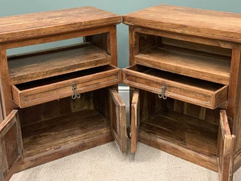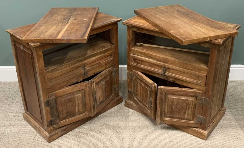 FOUR ITEMS OF MODERN HARDWOOD FURNITURE comprising two cabinets with swivel tops, 81 (h) x 76 (w) x 40cms (d), side table with three drawers and lower shelf, 75 (h) x 62 (w) x 32cms (d) and narrow bookcase, 70 (h) x 43 (w) x 21cms (d)Provenance: deceased estate Denbighshire
