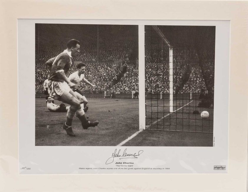 COLLECTION OF LIMITED EDITION PRINTS including b/w limited edition (PC/500) Legends Series of John Charles scoring for Juventus against Inter Milan and signed by John Charles, mounted but unframed, 56 x 38cms, b/w (AP/250) entitled 'The Gentle Giant', Wales' Legend John Charles scoring one of his two goals against England at Wembley in 1954, signed John Charles, mounted but unframed, 39 x 52cms, b.w limited edition (AP/125) of John Charles leaving the pitch with Ferenc Puskas after the Juventus European Cup quarter final replay against Real Madrid, February 1962, signed John Charles, mounted but unframed, 56 x 38cms (3)