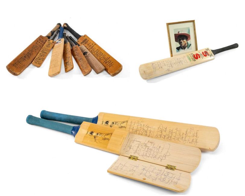 SEVEN SIGNED SOUVENIR CRICKET BATS comprising (1) 'South African Touring Team 1955' (2) England Vs. Australia 1948 (3) Pakistan 1954 (4) West Indies 1950, (5) Australia 1948 (6) Glamorgan 1997 and another unsigned (7)Provenance: private collection South WalesComments: all printed signatures apart from the Glamorgan 1997 which is hand signed