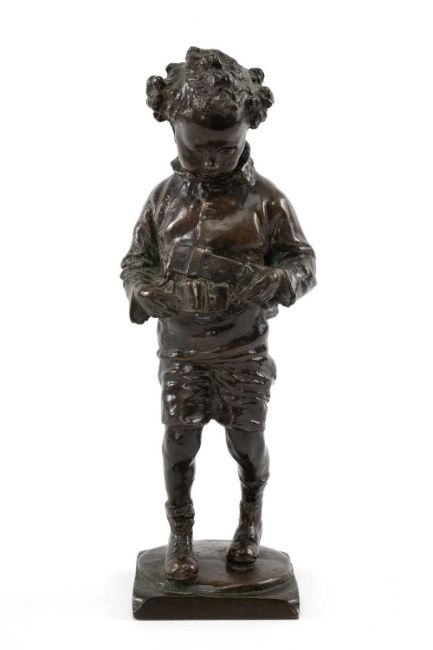 A SCOTTISH BRONZE SCULPTURE OF A YOUNG BOY AFFIXING A MILITARY BELT TO WAIST the boy modelled with curly hair and in school uniform of ankle boots, shorts and collared shirt, standing with legs apart on a square base, made by McDonald & Creswick, unsigned, circa 1910s / 1920s, 27cms highProvenance: by descent to the present owner via the McDonald family of McDonald & CreswickComments: in good condition without apparent defects or issues