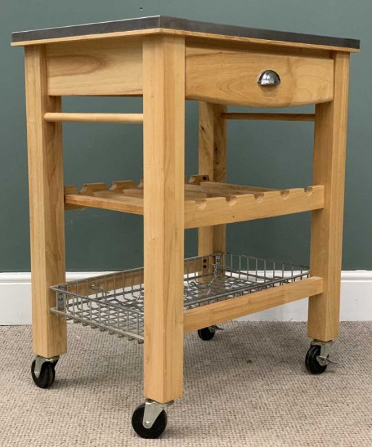 PLUS LOT 60 - MODERN KITCHEN WORKSTATION TROLLEY with stainless steel top, central wine rack and basket base, 87 (h) x 70 (w) x 50 (d) cmsProvenance: Private collection Denbighshire