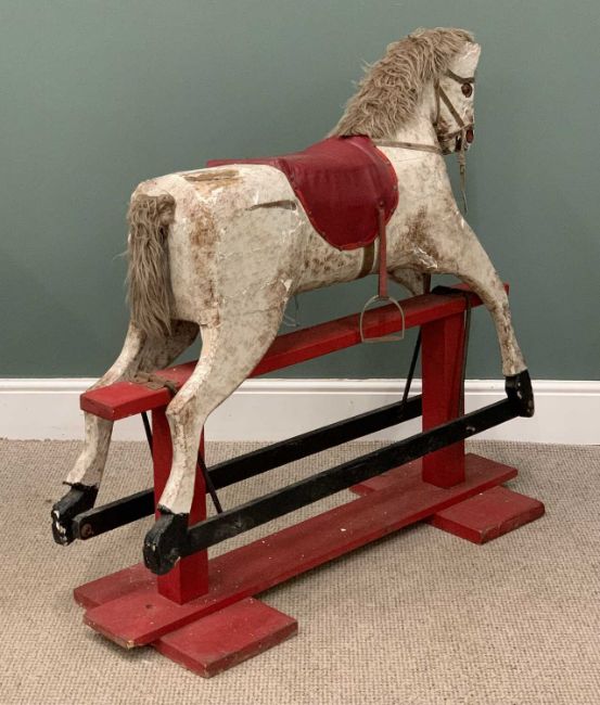 VINTAGE ROCKING HORSE painted white with a red base and saddle, 106 (h) x 116 (w) x 40 (d) cmsProvenance: Private collection Conwy