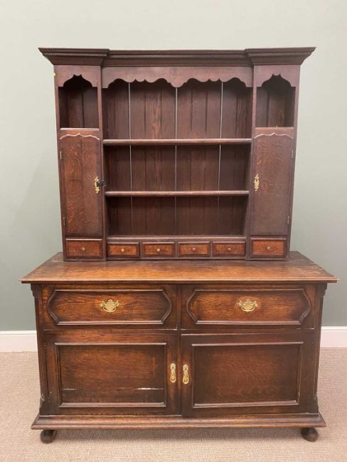 SIDEBOARD-DRESSER MARRIAGE, the rack with shaped cornice, three shelves, flanking cupboards and spice drawers, the base with drawers over two cupboard doors, 201 (h) x 153 (w) x 56 (d) cmsProvenance: Private collection Conwy
