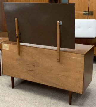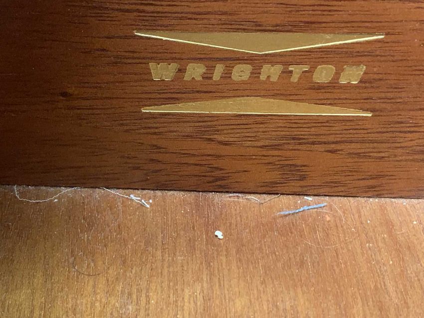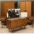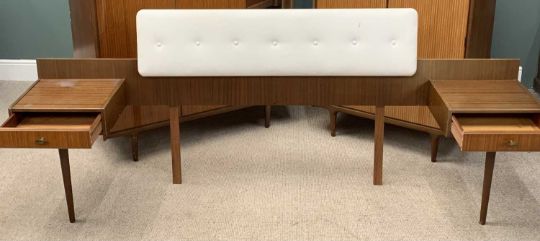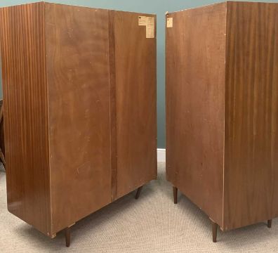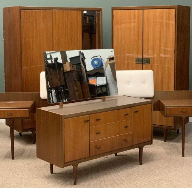 MID-CENTURY TEAK TYPE BEDROOM FURNITURE by Wrighton comprising a fitted wardrobe, 177 (h) x 92 (w) x 59 (d) cms, a larger wardrobe, 177 (h) x 122 (w) x 59 (d) cms, dressing table, 126 (h) x 122 (w) x 48 (d) cms, also including a bed headboard with end drawersProvenance: Private collection Gwynedd