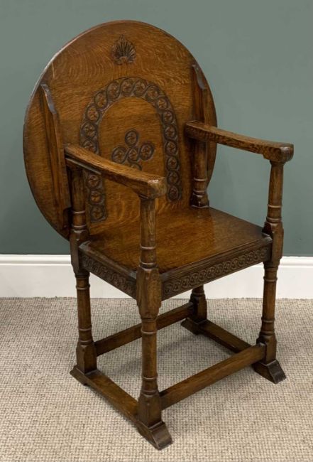 EARLY 20th CENTURY OAK MONK'S BENCH/CHAIR with circular carved top, 74 (h) x 69 (diam) cmsProvenance: Private collection Conwy