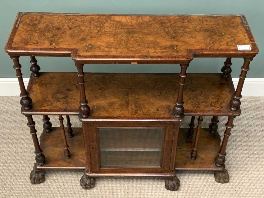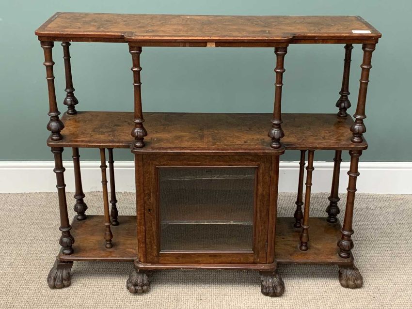 BURR WALNUT WHATNOT-CABINET having two upper shelves and a base with glazed doors and hairy paw feet, 98 (h) x 118 (w) x 37 (d) cmsProvenance: Private collection Conwy