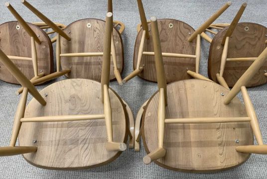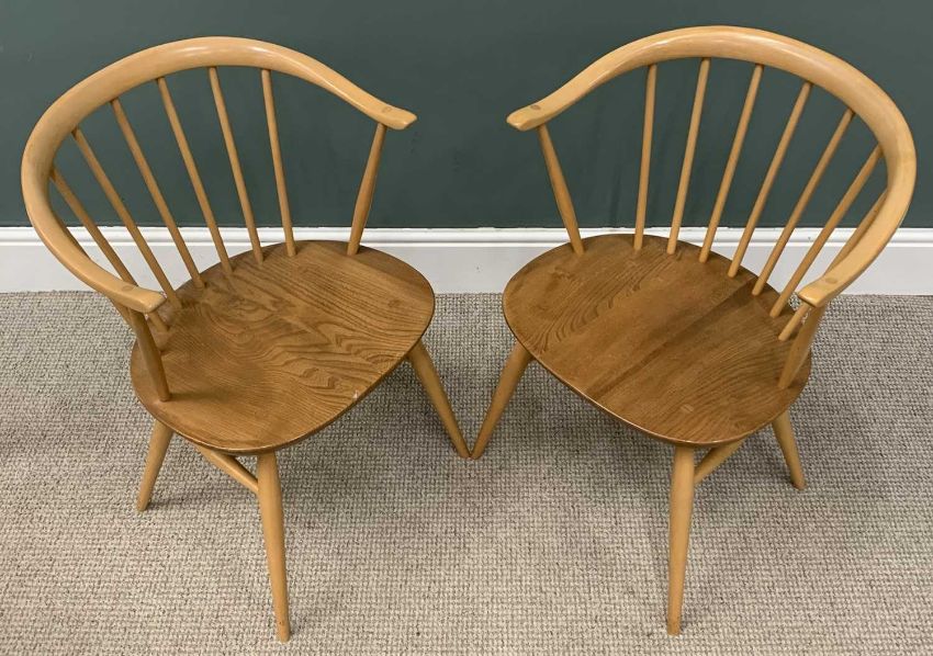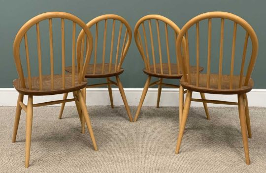 LIGHT ERCOL DINING CHAIRS, four with hoop and spindle back and a pair of tub shaped spindle back chairsProvenance: Private collection Denbighshire