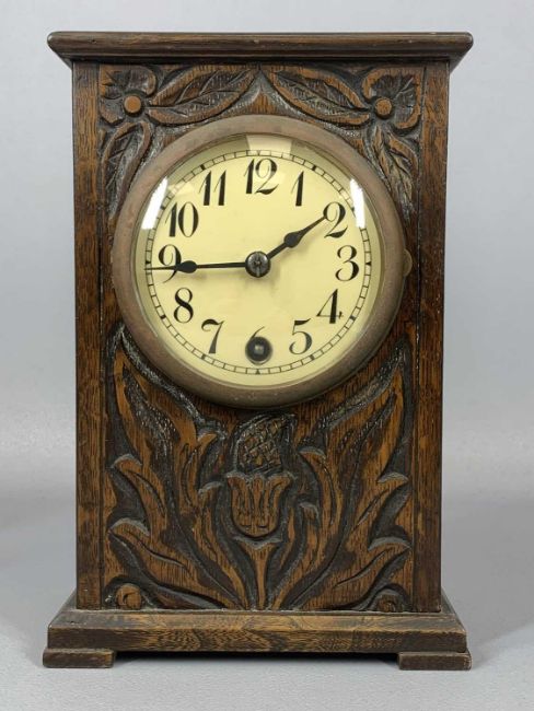 VICTORIAN BRASS BOUND ROSEWOOD TRINKET BOX, hinged lid, interior with lift-out tray, 12.5 (h) x 23 (w) x 16.5cms (d) and a German carved oak cased mantel clock, circular dial with black Arabic numerals, Junghans 8-day movement, 24 (h) x 16 (w) x 10cms (d)Provenance: private collection Ynys Mon