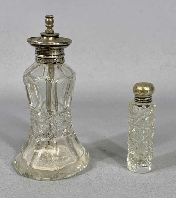 GROUP OF NINE SILVER MOUNTED GLASS DRESSING TABLE JARS & SCENT BOTTLES, 12cms (h) the tallestProvenance: private collection Gwynedd